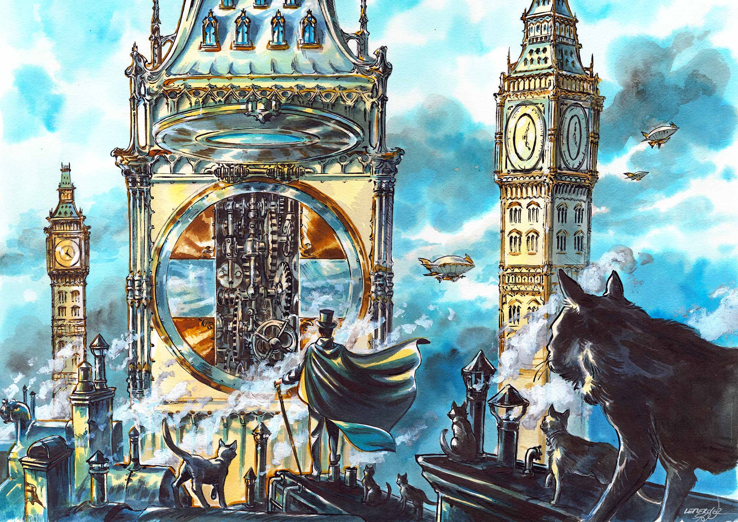 Découvrez « Lupin sur les Toits de Londres : L’Énigme des Horloges ». Dans cette illustration captivante, Lupin se tient au sommet des toits de la ville, entouré de chats complices. Son regard perçant est attiré par trois grandes horloges, rappelant l’emblématique Big Ben. Le ciel est peint dans des tons de turquoise et de bleu, tandis que la fumée s’échappe des cheminées. Au loin, des dirigeables ajoutent une touche de mystère à l’atmosphère. Plongez dans cet instant énigmatique où Lupin prépare peut-être son prochain coup audacieux.